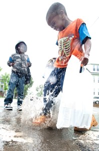 Mohamed Shueyb, 8, of Lewiston, couldn’t resist splashing in puddles on the sidewalk as he made his way home from school Friday afternoon.