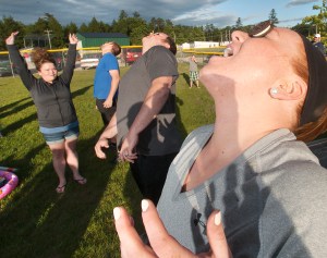 Amber Henderson and her husband, Chris, of Waterford and other competitors try to wriggle a cookie from their forehead into their mouths Friday night during the couples competition behind the Town Office in Mechanic Falls. The competition, a takeoff from the TV game show “Minute To Win It,” was one of many events in the couples competition sponsored by the Pink Feather Foundation. The event was a warm-up for Saturday’s Community Day in Mechanic Falls that includes dozens of activities and a parade at 11:30 a.m. For more information, visit www.mechanicfalls.govoffice.com