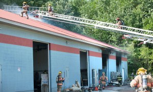 Fire flared out the ridge vent of the metal roof, fed by the wooden trusses beneath. Firefighters cut a section of the metal roof and peeled it back. A third alarm was called for personnel only for overhaul work.