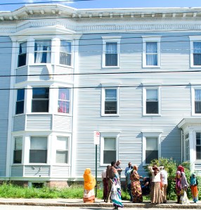 A crowd gathers around a nearly 3-year-old boy who fell from a third-floor window, top left, at 105 Walnut St. in Lewiston on Friday afternoon.