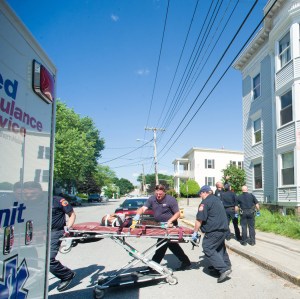 A nearly 3-year-old boy who fell from a third-floor apartment window at 105 Walnut St. on Friday afternoon is placed in an ambulance as police, right, look at the scene. The boy landed on a narrow strip of grass next to the building. A translator, speaking for the boy’s mother, told police the boy was standing at the window when the screen gave way and he tumbled out. He was unconscious when police arrived, but was crying and waving his arms when he was taken to Central Maine Medical Center by United Ambulance.