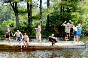 Friends and family cool off from Wednesday’s heat by jumping into the Androscoggin River at the Cherry Pond day use area in Greene on Wednesday. The public beach and boat launch area was built by FPL Energy Maine Hydro LLC to abide by federal regulations that require it to create recreational areas on property it acquired when it landed a lease to operate the Gulf Island Dam. From left are: Dominick Lamothe, 8, of Auburn; Aaron Pare, 10, of Greene; Christian Knowlton, 9, of Turner; Amanda Clark, 16, of Greene; Bobby Bernier, 6, of Lewiston; Jason Bazinet of Lewiston and Chantelle Plourde of Auburn.