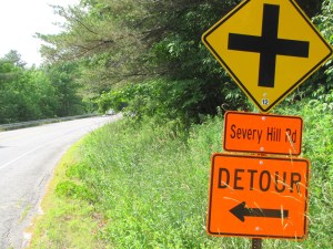 Just before the turn to Morse Hill Road, signs are posted on Route 17. The first says Detour Ahead. A second sign says Severy Hill Road Detour with an arrow pointing to the turn down the road on the left.