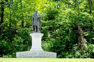 The Edward Little statue was unveiled during a ceremony attended by thousands, at Edward Little Park in 1877. For years the statue stood in front of what used to be the high school and the park. In 1965 it was moved to the new high school on Harris Street when the school opened.