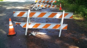 “These barricades were placed to prevent someone from driving into a huge ditch created by torrential rains and flooding earlier this summer,” he said. “Prior to this, someone destroyed a ‘No Thru Trucks’ sign in the same area.”