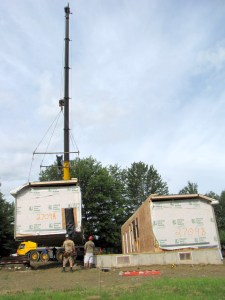 FARMINGTON — Theresa Martin watched Thursday as a large crane swung sections of her new modular home onto the foundation on Knowlton Corner Road.