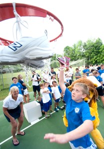 Connor Rouze, 11, from Westminster, Colo., gets a boost from the Max Cure Foundation mascot as he dunks a sneaker on the basketball court at Kamp Kohut in Oxford on Thursday morning. The Maine Camp Experience teamed up with the Max Cure Foundation in a “Dunk Your Kicks” event to help raise money for pediatric cancer by collecting used sneakers that will be turned into a recycler for about $1 a pair. Kamp Kohut is one of several summer camps participating in the event that organizers hope will surpass last year’s total of 1,000 sneakers.