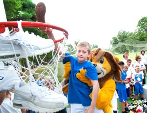 Connor Rouze, 11, of Westminster, Colo., gets a boost from the Max Cure Foundation mascot as he dunks a sneaker on the basketball court at Kamp Kohut in Oxford on Thursday morning. The Maine Camp Experience teamed up with the Max Cure Foundation in a “Dunk Your Kicks” event to help raise money for pediatric cancer by collecting used sneakers that will be turned in to a recycler for about $1 a pair. Kamp Kohut is one of several summer camps participating in the event that organizers hope will surpass last year’s total of 1,000 sneakers.