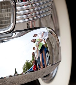 Tina Agren of Auburn is reflected in the fender of a 1953 Cadillac with her granddaughter, Sarah Agren, in Paris on Saturday afternoon. “I was just telling her that’s a whitewall and you don’t see those much any more.”
