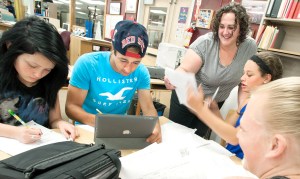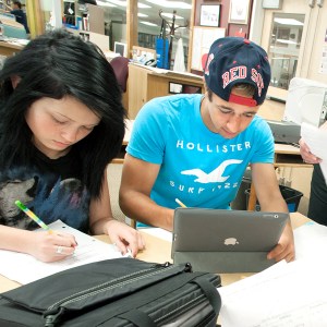 The class is taught in the customized learning style, in which teachers no longer lecture, and students work on their own or in groups, conferring with teachers.