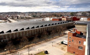 The differences between 1913 and 2014 are noticeable. Only 13 saw-tooth roof peaks existed on Bates Mill No. 5 when the photo was taken in 1913, where today 18 stand. Mills in the background have either been torn down or razed by fire, and apartment buildings stand where the Hilton Garden Inn Auburn Riverwatch is today. Canal street in the foreground has changed substantially.