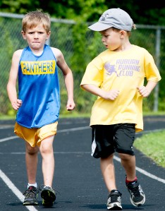 Brodyn Rodrigue, right, of the Auburn Parks and Recreation Track Club checks on William Wallingford of the Poland area Panther Track Club as the 5-year-olds compete in the race walk at the regional qualifying meet Thursday at Edward little High School in Auburn. The top four finishers in each event will advance to the state meet Aug. 9 in Windham. “Tom (Menendez) and Carolyn (Court) have done a phenomenal job in the past 20 years,” said Rebecca Hefty, an assistant and parent in the program. “Each year just keeps getting better and better. It’s a gigantic feeder program for the middle school and high school.” The Auburn Track and Field Club is the defending state champion.
