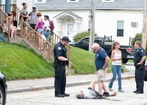 Lewiston Police/Code Enforcement Liason Officer Jeff Baril, center, stands over an unresponsive Walton Shattuck, 56, in the middle of Shawmut Street on Sunday afternoon. Baril said he was driving down Pine Street when he saw Shattuck with a knife, chasing a woman. Two unknown men knocked the knife, in grass at left, out of Shattuck’s hand after pushing him to the ground, Baril said. Baril restrained the suspect until additional police officers arrived. When United Ambulance arrived, Shattuck sat up and admitted to drinking a fifth of 100-proof alcohol. He was checked at a hospital. Shattuck was taken to the Androscoggin County Jail, and was charged with disorderly conduct and terrorizing. Bail was set at $300.
