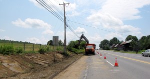 A crew from Farmington Public Works ditches a section of the Wilton Road on Monday. The ditch is not deep enough and water overflows onto the highway, Public Works Director Denis Castonguay said. Using a rented excavator, the crew has done some work on the Farmington Falls and Davis roads. “We’re trying to ramp up our ditch effort,” he said.