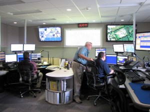 Stan Wheeler, director of the Franklin County Regional Communications Center in Farmington, talks with dispatcher Levi Gould on Wednesday during an open house. The center opened in April at 124 County Way. Dispatcher Michael Helie is at left.