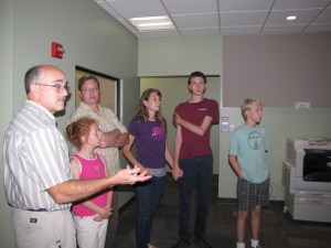 On his first day as a supervisor at the Franklin County Regional Communications Center at 123 County Way in Farmington, Tom Marble, left, gives the Finn family of Strong a tour during an open house Wednesday. Marble, a dispatcher, stands with Addie, Tim, Amie, Josiah and Isaiah Finn. Tim Finn works for NorthStar Emergency Medical Services and the scanner runs constantly in their home, Amie Finn said. They thought their children would like to see the new space where emergency calls are dispatched.