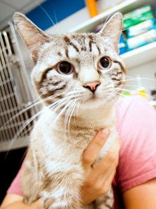 The shelter’s veterinarian discovered that someone had tried to neuter the cat with a rubber band and the area was badly infected.