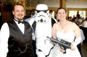 “On our way up to Maine for our wedding, we stopped in Newington, N.H. to see the midnight opening of the movie,” said Bob. And now, a full-suited stormtrooper was making an appearance at his wedding reception.