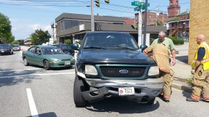Lewiston firefighters check out a two-car crash at Chestnut and Canal streets Wednesday afternoon. The collision was reported with injuries, but the drivers of both vehicles refused medical treatment when first responders arrived.