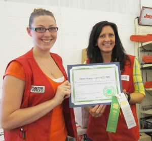 Tractor Supply Co. in Oxford won two awards for outstanding performance, raising money for 4-H camps and after-school programs and for scholarships for youth to explore interests in topics ranging from animal science to robotics. Taylor Black, left, a former 4-H member and current sales associate at Tractor Supply Co., sold the most paper clovers during the 2014 spring campaign. She and Assistant Manager Maria Brown display the District and Class Champion awards. The 4-H/TSC Paper Clover Campaign is a nationwide, in-store fundraiser that benefits 4-H programming in communities where TSC stores are located. The spring 2014 campaign raised more than $787,000 to support 4-H at the local, state and national levels. TSC in Oxford received the District Champion Award for the highest transaction percentage for paper clover donations in its district. It also earned the Class Champion Award.