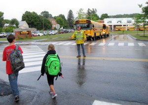 “Welcome back,” Farmington crossing guard Robert Hallman told students hurrying to catch a bus at W.G. Mallett School early Tuesday morning. Gabe Mealey and Emma Dunn were meeting a bus to take them to Cascade Brook School in Farmington.