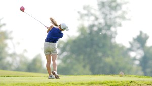 Stephanie Rodrigue, a freshman at Lewiston High School, hits from the second tee during a match against Brunswick High School at Martindale Country Club in Auburn on Tuesday.