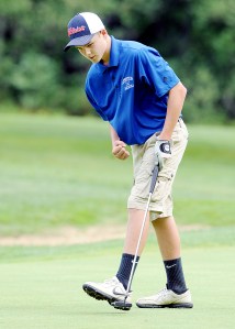 Jeromey Rancourt, a sophomore at Lewiston High School, pumps his fist after sinking a putt on the fourth hole during a match against Brunswick High School at Martindale Country Club in Auburn on Tuesday.