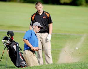 Brendon Croteau, a junior at Lewiston High School, hits out of the bunker on the fourth hole during a match against Brunswick High School at Martindale Country Club in Auburn on Tuesday. John Parker of Brunswick watches the shot.