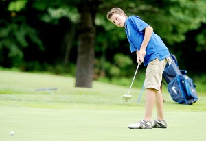 Andrew Loisel, a junior at Lewiston High School, hits a long putt on the fourth hole during a match against Brunswick High School at Martindale Country Club in Auburn on Tuesday.