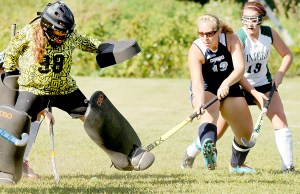 Inspired by the pregame ceremony, the Ramblers started strong. They earned a couple of penalty corners quickly in the Dirigo circle, and ultimately forced a penalty stroke after a Cougars defender stopped a sure goal with her foot.