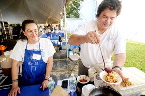 Stavros Mendros of Lewiston and his sister, Jaye Goulet, serve a baklava blueberry sundae during the Lewiston-Auburn Greek Festival at Holy Trinity Greek Orthodox Church on Hogan Road in Lewiston on Thursday.