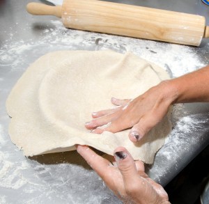 Twitchell says the last step is to roll the dough out evenly on a floured surface, about 1/8-inch thick and two inches larger than the inverted pie pan it will go into.