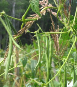 Fresh for the picking right now are the pole beans and a few summer squash. My beans have done an admirable job climbing up the early corn plants and are now dangling happily from corn tassels and corn stalks as two-thirds of the “three sisters” plantings. The pumpkins, which are the third sister in that particular patch, have been subject to feasting by the local deer. I used a spray on the small pumpkins known as Deer-Be-Gone and it seems to work. Although the container does not state that it is organic, the ingredients are all plant-based.