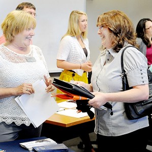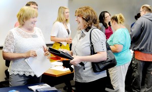 Keri Forgues, right, of Lewiston speaks with Lyn Alleborn, an agency recruiter with Prudential, about job opportunities during the Lewiston CareerCenter job fair on Monday. Thirty-five employers with “hundreds of jobs” made themselves available to people looking for work, said CareerCenter Manager Mary LaFontaine. The center hosts a job fair on the first Monday of each month from 9 to 11 a.m., said LaFontaine. “It is important to dress like you are going to an interview,” said LaFontaine. “Your first impression is a lasting impression,” she said. “It’s basically your first interview,” LaFontaine said about talking to local employers during a job fair. “Have a resume in hand and be ready to talk about what you have to offer,” suggested LaFontaine. She said that anyone looking for work that needs help with her tips are welcome to stop in at the CareerCenter before going to a job fair. Forgues said that the CareerCenter offers “a lot of great information and lots of resources” to help with job searching.