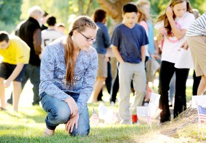 Aaron Perkins, 13, places an American flag in memory of Army specialist Daniel Cunningham of Lewiston during a Maine fallen heroes ceremony at Auburn Middle School on Friday. Students researched each of the 92 soldiers from Maine who have died since the Sept. 11 terrorist attacks in 2001. They read what they discovered before placing the card of information and a flag for each fallen soldier on the school’s front lawn. “We are honoring our heroes that have passed since 9-11,” said humanities teacher Diana Carson. The project started when students looked up the words to the Pledge of Allegiance. “We have been saying it each morning since kindergarten,” said Carson. The issue was raised that very few know what the words to the pledge meant, said Carson. Students were surprised at the number of soldiers who were single parents and how many joined the service to raise money for college, said Carson. Cunningham died on April 4, 2003, while serving in the U.S. Army during Operation Iraqi Freedom.