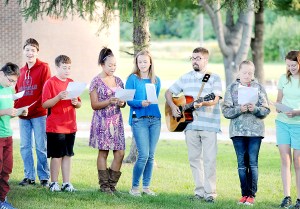Students sing “America the Beautiful” as music teacher Jason Paquette plays the guitar during the fallen heroes ceremony.