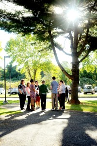 Students gather in a small group to read what they learned about fallen Maine soldiers.