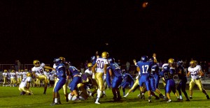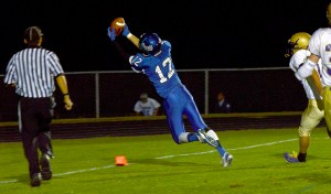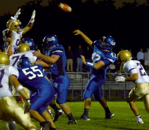 Lewiston even started with a little momentum, recovering a loose ball on an onside kick on the opening kickoff. The Blue Devils drove as close as the 5 but were stopped. Later in the half, Lewiston got as close as the 7. Again the drive stalled. Lewiston had a touchdown pass to Kyle Ullrich ruled out of bounds during that series, even though the catch appeared complete inbounds.