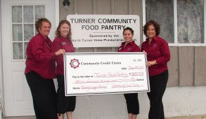 Community Credit Union of Auburn and Lewiston recently presented the Turner Food Pantry with a donation of $320. The pantry is in Boofy Quimby Memorial Center in North Turner and is staffed by volunteers from the North Turner Union Presbyterian Church, who offer food to low-income individuals and families. Individuals interested in the program need to contact the Turner Town Office for eligibility by calling 255-3414. The donation by the credit union, which will soon open a branch in Turner, is part of the Maine Credit Unions’ Campaign for Ending Hunger. At the donation ceremony were Community Credit Union personnel, from left, Laurie Pelletier, Auburn Branch manager; Betsy Sibley, marketing director; Natalie Green, ACH coordinator; and Kerry Wood, president/CEO.