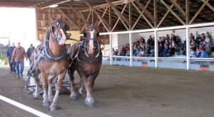 Mike and Tom dig in their heels to pull 8,850 pounds a distance of 330 feet Friday at the Farmington Fair. The pair won the 3,400-and-under class pull. Each horse weighs about 1,700 pounds, said Mike’s owner, Dan Smith of Massachusetts, who drove the horses. The fair will continue Saturday with a dairy and poultry show at 9 a.m., racing at 2 p.m., mutton busting for children ages 7 to 8 at 2 p.m. and a demolition derby at 7 p.m.