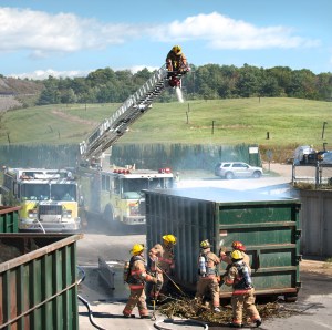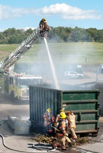 Lewiston firefighters extinguish flames in a recycling container at the solid waste facility on River Road in Lewiston on Tuesday afternoon. Officials said sparks from welders building an addition to the recycling area ignited brush in the container. A front-end loader pulled the receptacle away from the structure.