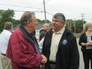 AFL-CIO President Richard Trumka joined Michaud in two locations, first greeting workers at Bath Iron Works as they filed out of the shipyard for lunch and then visiting with unionized workers who have been working without a contract for two years at Huhtamaki North America, a paper goods manufacturer in Waterville.