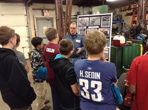 Joe Wing of Mountain Machine on the Hotel Road in Auburn explains machine tool to students Friday. Auburn sixth graders toured several companies Friday as part of a demonstration of the local jobs available in manufacturing.