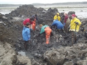 Seton and Kraus also were down in the shallow hole with the others, digging with shovels and clam rakes. Like the students and volunteers, by early afternoon, they were suitably smeared with mud. But the crew was dressed for the occasion, most of them wearing boots, hip boots, chest waders and rubber gloves.