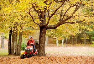 Steve Izer collects fallen leaves from his yard in Lisbon on Tuesday. “We got a lot of leaves and pine needles,” said Izer, who uses the leaves to make compost for his gardens.