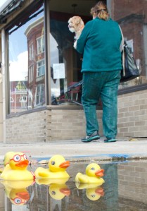 A woman walks past a puddle with rubber duckies on Congress Street in Rumford on Wednesday afternoon. Barbara Bartash, who runs Bartash Card & Gifts with her husband, John, put them in front of their store to” brighten up the downtown and make people smile with all the bad stuff going on out there.”