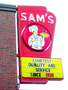 Sam’s Italian Sandwich Shoppe began in 1939 by Sam Bennett, making salami Italian sandwiches in a small shop located near the intersection of Minot Avenue and Elm Street in Auburn. The cement foundation still exists, almost as a plaque in honor of the founder.