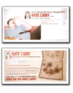 Libby says the mailer, which features a photo of a heavy-set man eating pizza with a television remote control resting on his belly, declares, “Libby won’t reform welfare,” is simply unfair and inaccurate. The man in the photo is not Libby.
