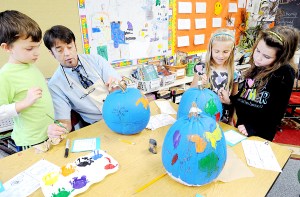 Third-grade teacher Bill Murray works with Josiah Goding while Emily Day, right, and Kaelyn Langlois work together to paint the seven continents and the Earth’s five oceans on pumpkins during their social studies class at Sherwood Heights Elementary School in Auburn on Thursday. Murray gathers donated pumpkins from local farms each October for a geography lesson. Murray has done the project for the past seven years.