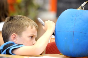 Derek Becvar, 8, draws the equator and prime meridian on a pumpkin during his social studies class at Sherwood Heights Elementary School in Auburn on Thursday.